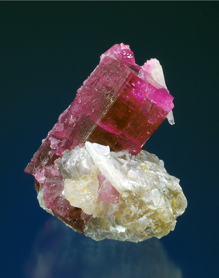 This is a rubelite matrix specimen from Ailton Barbosa's great find at the Jonas mine. The pocket was discovered in 1978, and the rubelite quality from this pocket still sets the standard for the species. This specimen features one richly coloured crystal, capped by a blade of albite on the top right side. Repaired once.